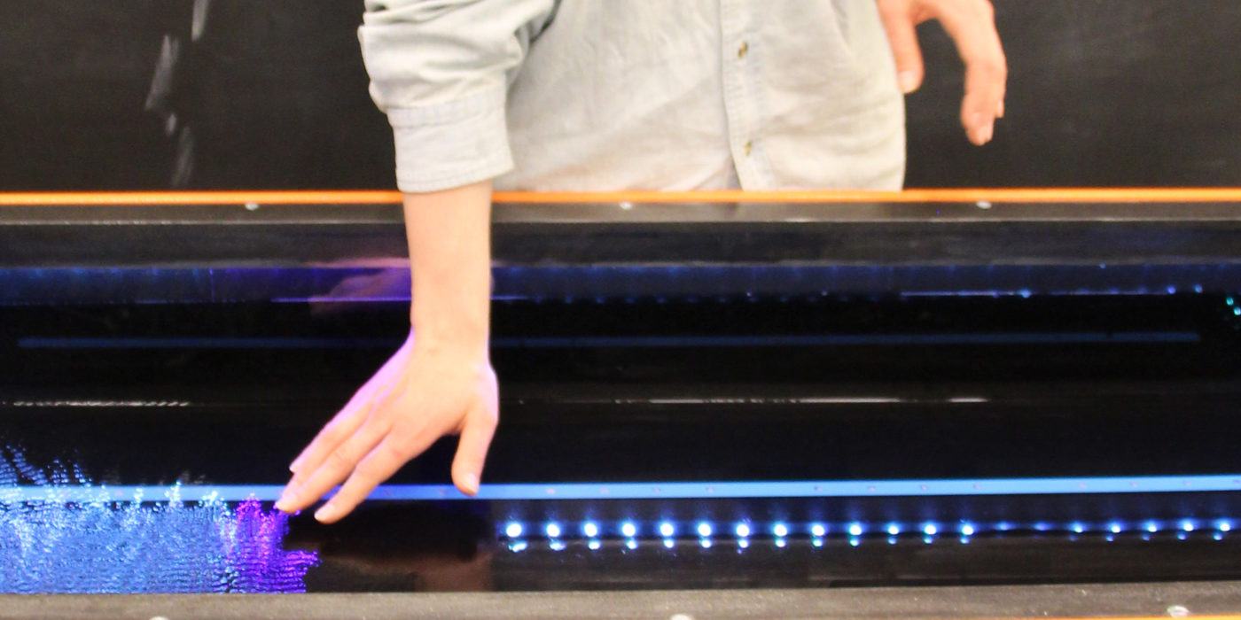 Sinus is an interactive installation where children can explore sound waves in a pool of water. The sound waves will appear in the water as the children move their hand over the water surface, making Sinus engaging, encouraging and fun.